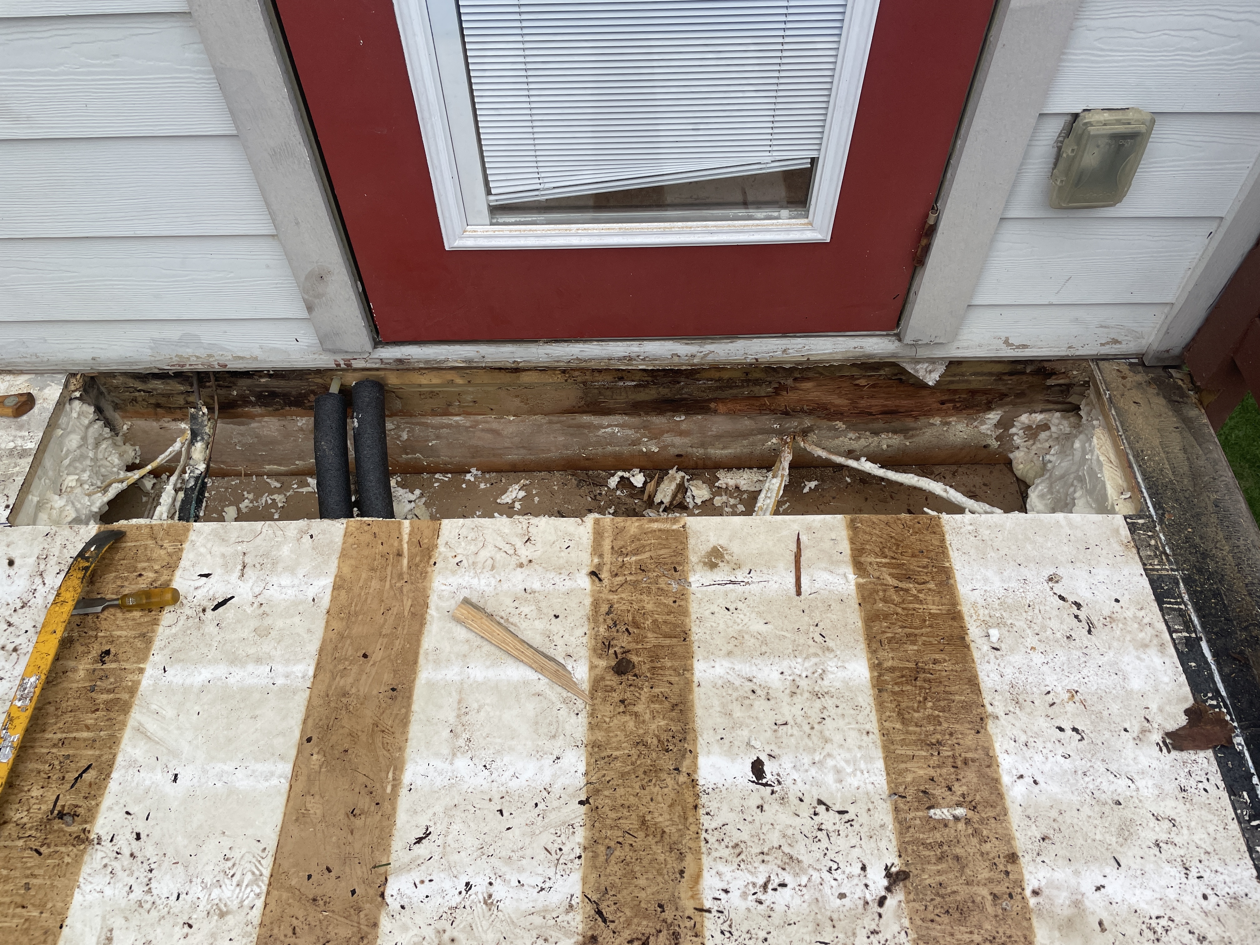The 2x8 ledger that the OSB rested on was almost completely rotted away. The structural LVL plywood behind it was also damaged. Review of construction plans and photos show the beam was two layers thick. It will need to be sistered with metal plates or another LVL beam.